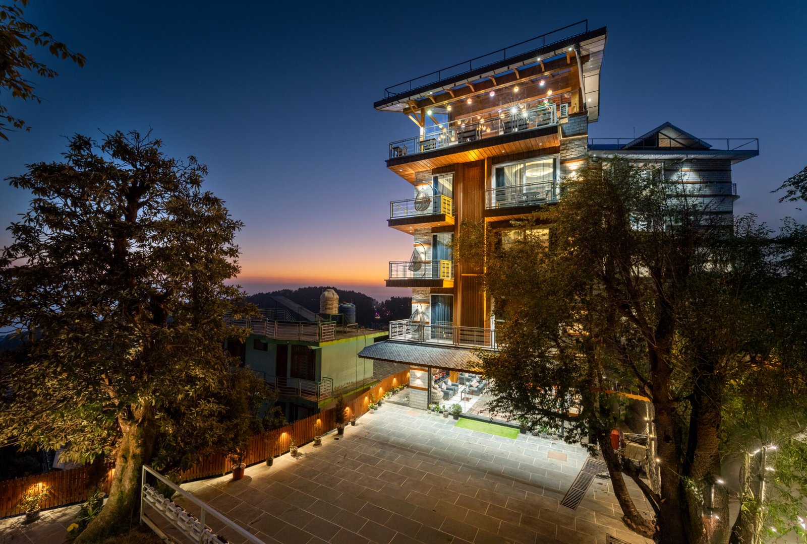 The property offers multiple room categories, including Deluxe, Superior and King rooms, along with valley-view options. Some rooms feature private balconies, jacuzzi or bathtub options, heated flooring, rainfall showers with heated seats, and 55-inch Smart TVs. The hotel also includes a glasshouse café overlooking the mountains, co-working spaces, a sunset-facing lawn, lift access, 24-hour security and gated parking.