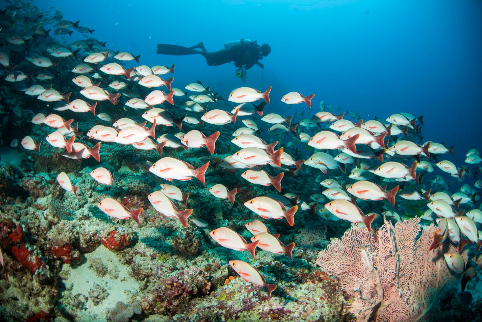 Just minutes from the island’s reef lies the Kudhi Maa Shipwreck, a 52-metre sunken Japanese cargo ship intentionally submerged in 1999 that has since transformed into a vibrant artificial reef. Today, certified divers glide past coral-covered structures as schools of batfish, fusiliers, and reef predators circle the wreck.